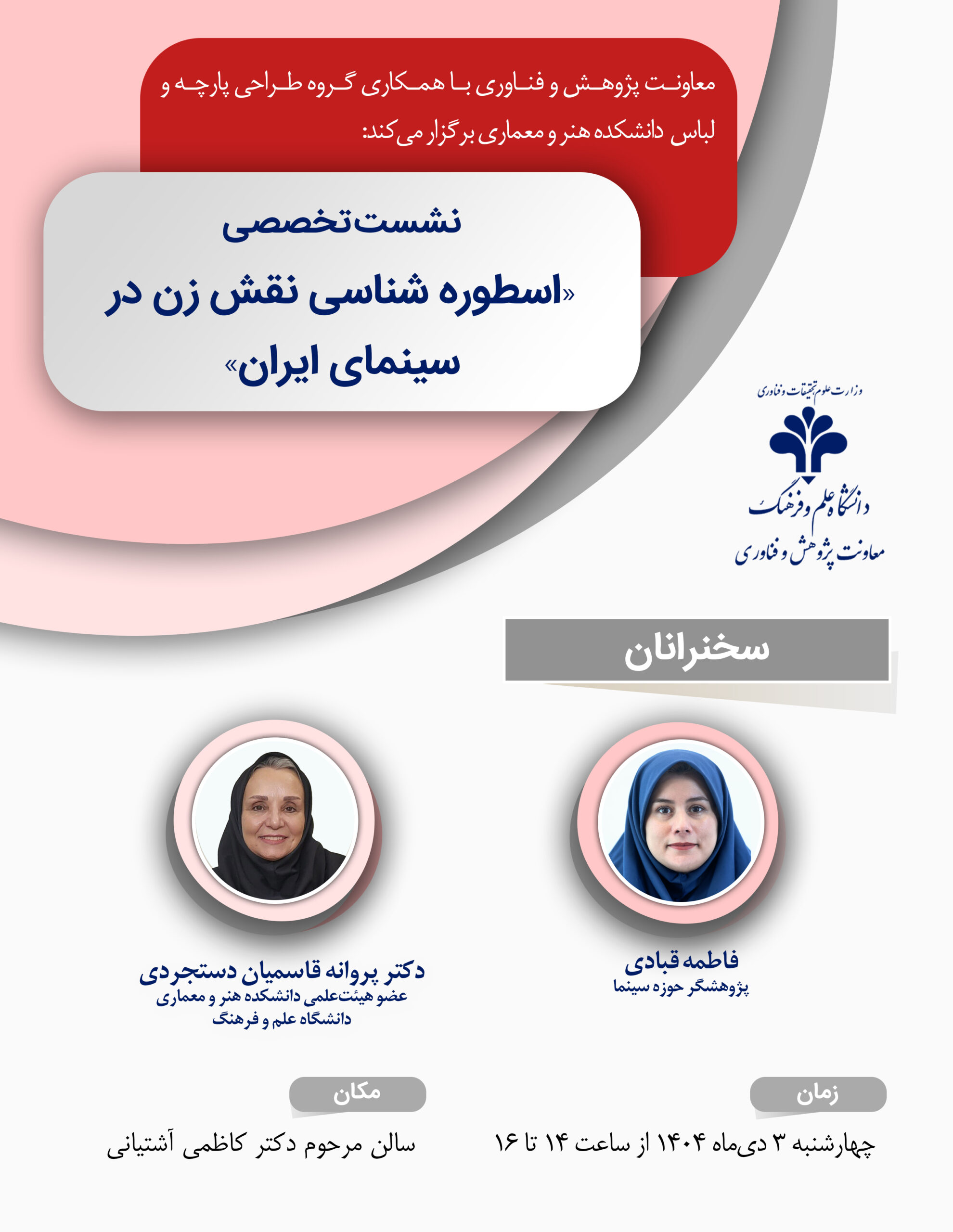 03دی2:00 ب.ظ4:00 ب.ظنشست تخصصی «اسطوره‌شناسی نقش زن در سينماي ايران»خوانشي تحليلي از تصوير زن، روايت، معنا و بازنمايي در سينمای ايران