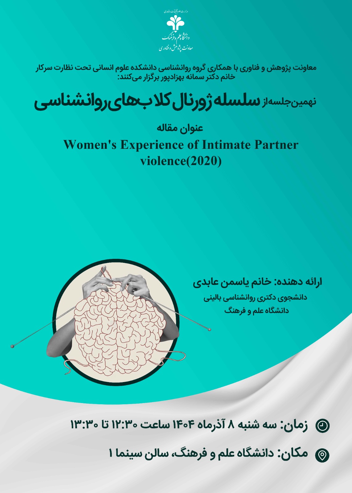 در این نشست، خانم یاسمن عابدی (دانشجوی دکتری روانشناسی بالینی) به بررسی و ارائه مقالهWomen’s Experience of Intimate Partner Violence (2020)خواهد پرداخت. 🗓 سهشنبه ۸