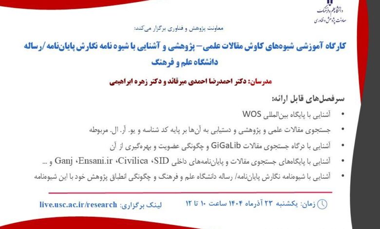 کارگاه «آموزشی شیوههای کاوش مقالات علمی-پژوهشی و آشنایی با شیوهنامه نگارش پایاننامه/رساله دانشگاه علم و فرهنگ» ویژه دانشجویان این دانشگاه، روز یکشنبه ۲۳ آذرماه ۱۴۰۴ به صورت برخط برگزار شد.
